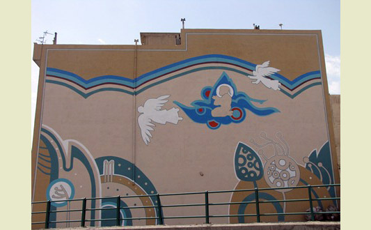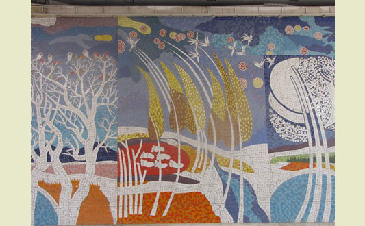 طراح از عناصر آشنای فرهنگ ایرانی همچون خورشید و گردونه مهر در راستای خلق اثر بهزیبایی بهره برده است. این اثر فرمالیستی و تجریدی با استفاده از تکنیک کاشی شکسته مستقیم، جلوه خاصی به فضای قرارگیری خود بخشیده است. در عین اینکه رنگ زمینه با رنگ فضای اطراف هماهنگی دارد، سایر رنگهای به کار رفته بر تلطیف فضای حاکم بر کار، موثر بوده است.