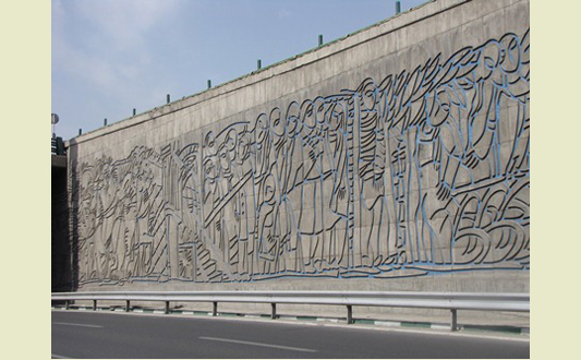 این اثر بهعنوان یکی از معدود نقش برجسته های بتن رنگی در ایران از فضایی انتزاعی برخوردار است و کلیت طرح شمایی از پلان یک شهر کویری را تداعی میکند. رنگ خاص این نقش برجسته موجب نزدیکی آن به سفال و در نتیجه همگونی بیشتر با معماری ایران گردیده است. از دیگر ویژگی های این طرح آکوستیک بودن آن است، در واقع این طرح در یک فضای شهری اتوبانی برگشت صدا ندارد و ضمن همگونی با فضای اطراف خود، بهدلیل نبودن روایتگری - متناسب با ویژگی حرکت با سرعت بالا در بزرگراه و عدم درک روایت- صرفاً موجب استراحت چشم مخاطب و یادآور معماری کهن ایران و تلطیف فضای بتنی و سنگین شهری می شود.