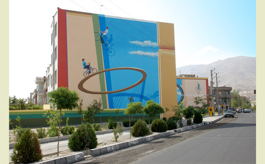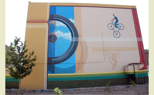 دوچرخهسوارانی که برخلاف جاذبه زمین و گاه در آسمان در حال حرکت هستند هر چند بهصورت واقعگرا طراحی شدهاند، لیکن فضایی فراواقعگرایانه (سوررئالیستی) و آبستره خلق کردهاند. در طراحی فضای رنگی با هوشمندی کامل از رنگ استفاده شده که متاثر از فضای ساختمانهای اطراف است و ترکیببندی رنگی بهگونهای است که چشم در یک لحظه کل اثر و کل دیوار را یکجا میبیند که این نکتهای بسیار مهم در نقاشی دیواری است.