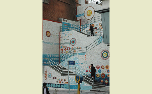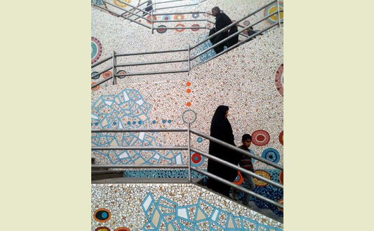 این نقوش تجریدی که با تکنیک کاشی شکسته مستقیم بر دیواره این پلکان نقش بسته اند، فضایی کاملاً آبستره بوجود آورده اند که در عین حال منافاتی با فرم خام دیوار و فضای پیرامون خود ندارد. در تکنیک کاشی شکسته مستقیم، تکه های کاشی در محل و بر اساس نقشه طرح در مکان خاص خود چسبانده میشوند.