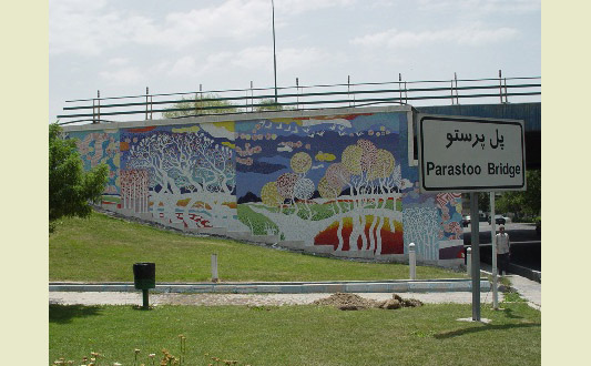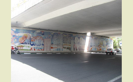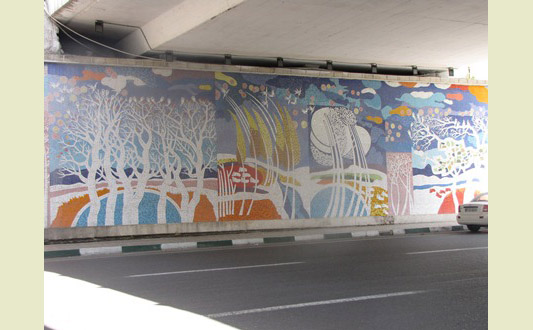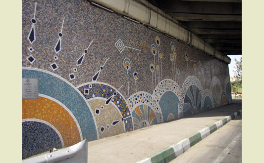 در این طرح عناصر فرهنگ ایرانی در نظر گرفته شده با رنگهای هماهنگ و دارای هارمونی فضایی تزئینی مناسب با محیط پیرامون را خلق نمودهاند برای ایجاد این اثر از روش کاشیشکسته بهصورت غیر مستقیم بهرهگیری شده است. در این روش تکه های کاشی روی سطوح توری یک متر در یک متر چسبانده شده و روی دیوار نصب میشود.