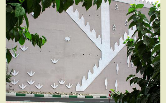 در این اثر خصوصیات منحصربه فرد دیوار به دقت در نظر گرفته شده است، از آن جمله می توان به ساختار هندسی، تقسیم بندی خاص و ابعاد بسیار بزرگ آن اشاره کرد. طرح ضمن حفظ وتقویت ساختار ذاتی دیوار که یادآور دیوارهای عظیم از یک دژ باستانی است، با استفاده از تکنیک نقش برجسته و عناصر بصری آشنا-که الهامگرفته از نقوش دست بافته های قدیمی ایران است-گستره عظیم آن را تبدیل به فضایی دلنشین و چشم نواز نموده است.