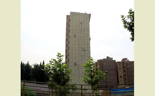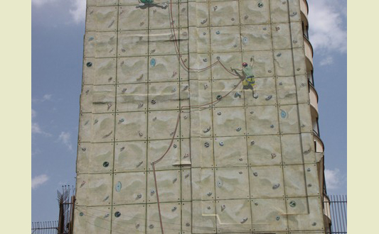در این اثر طراح از خصوصیت مرتفع بودن دیوار ساختمان بهره گرفته و بالا رفتن تعدادی سنگ نورد را بهصورتی واقعگرایانه نقاشی نموده است. همچنین برای تکمیل این روند، طرح یک کوهنورد از فلز بر روی بام بنا قرار داده شده است.
