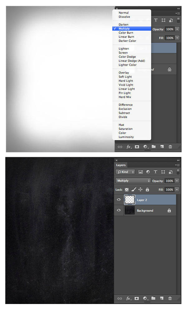 یک vignette کوچک برای عمق بخشی به تصویر خود اضافه کنید. برای انجام دادن آن، یک لایه جدید بالای بکگراند تخته سیاه ایجاد نمائید. در آن لایه به سادگی از soft brush استفاده کنید و یک خاکستری تیره دور لبه ها همانطوریکه در زیر دیده می شود بکشید. حالت blending این لایه را به multiply تغییر دهید و opacityرا برای بدست آوردن مقدار تاریکی مطلوب تنظیم کنید.