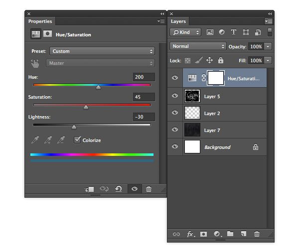 آپشن Hue/Saturationدر پانل Properties باز خواهد شد. در زیر تنظیمات استفاده شده یرای رنگی کردن گچ آبی است. همانطور که نشان داده شده است.