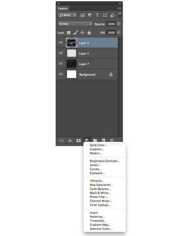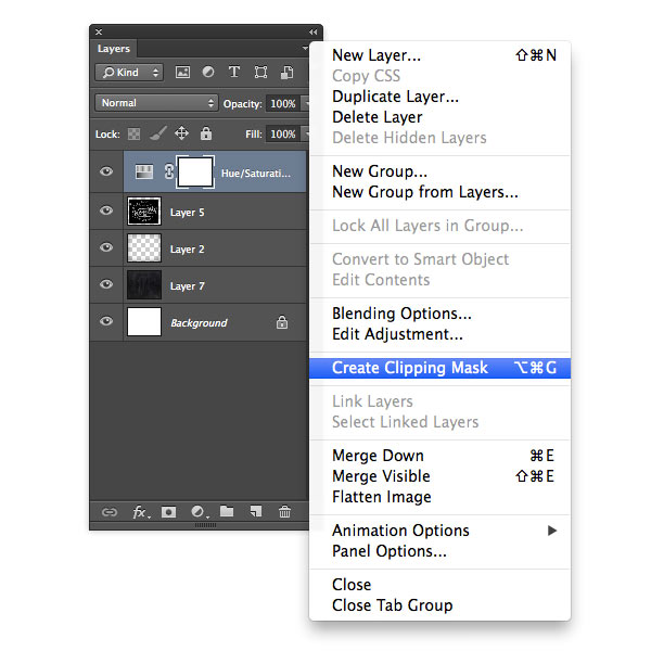 حالا ما به استفاده از Clipping Mask احتیاج داریم بنابراین adjustment layer فقط بر رنگ طرح دستی تاثیر گذار است. و نه بر بکگراند یا vignette. شما می توانید Clipping Mask را در چند روش اضافه کنید. در این گام ما Clipping Mask بوسیله انتخاب لایه و سپس کلیک کردن در منو fly out در پانل Layers اضافه خواهیم کرد. همانطور که نشان داده شده است.