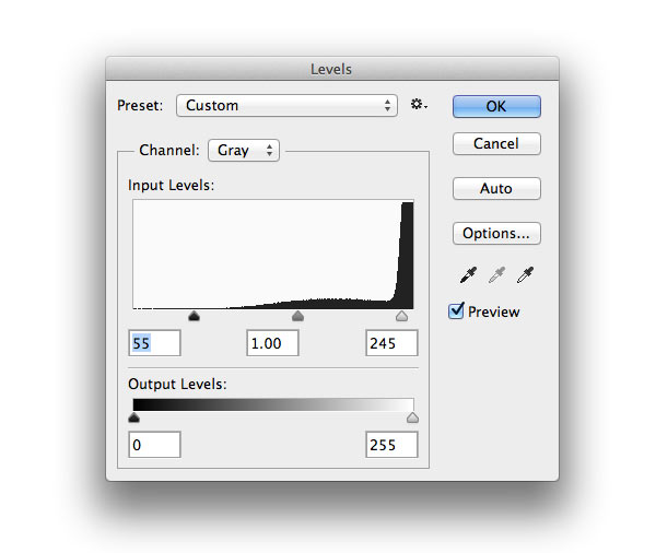 وقتی لوگوی خود را ترسیم کردید، آن را اسکن و در فتوشاپ باز کنید. حالا از منوی adjustment و levels برای بالابردن سفیدی آن و دستیابی به کنتراست بهتر استفاده کنید. این به شما کمک می کند لکه های اضافی را از بین ببرید. من از تنظیمات زیر برای اسکیس لوگوی رشته فرنگی خانگی استفاده کرده ام.