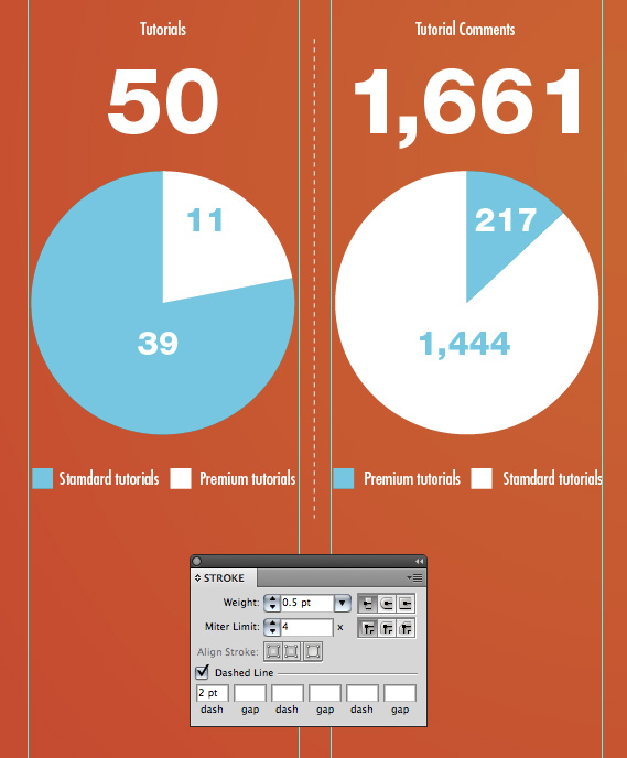 همانگونه که توقع دارید، من از گرید ها به عنوان پایه هایی برای میزان پهنای گراف ها استفاده می کنم. برای ایجاد یک خط تقسیم بین گراف ها از Pen Tool استفاده کنید و یک خط عمودی ترسیم کنید. در پانل Stroke ، Dashed Line را انتخاب کنید و 2pt را در باکس اول وارد نمائید. نکته: برای strokesترسیم شده قبلی با مقیاس، به چک کردن یا عدم چک Scale Strokes و Effect در پانل اولویت ها Command-K برای دستیابی به strokes با مقیاس و بدون مقیاس استفاده کنید.