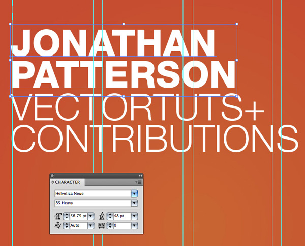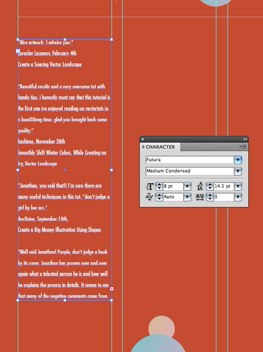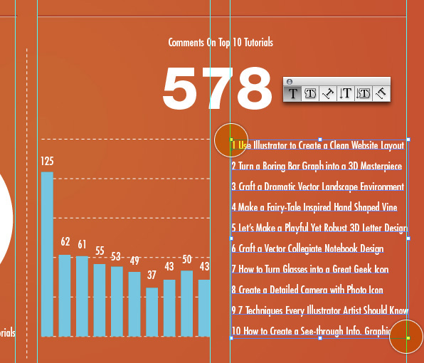 در زیر من می خواهم متنی را تنظیم کنم که با پهنای گراف تنظیم شود. برای انجام آن از Text Tool و click-drag از بالای دایره هایلایت شده به پایین محدوده هایلایت شده استفاده میکنم. این محدوده متن را به گونه ای که اطلاعات دقیقا بین guides فیت باشد پیش تعریف خواهد کرد.
