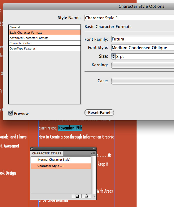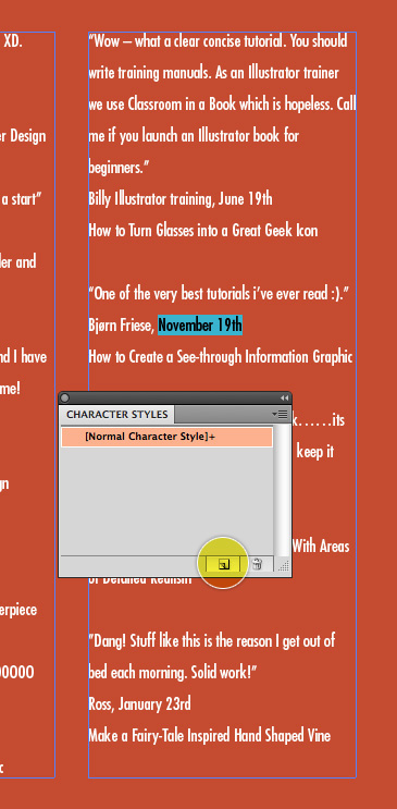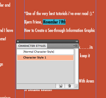 وقتی با مقادیر بزرگی از text سروکار دارید این یک این ایده خوب برای ایجاد سبک ها،برای متن ها است. در این مورد من یک سبک برای تاریخ و عنوان آموزش ایجاد کرده ام. سبک ها تغییرات همه متن در یک مرتبه را آسان می کنند اگر حتی شما به برگشتن و ایجاد تغییراتی در رنگ، اندازه ، فونت و غیره احتیاج داشته باشید. برای ایجاد یک سبک ابتدا متنی که شما می خواهید سبک باشد انتخاب کنید بعدا در پانل Character Styles (اگر شما یک پاراگراف از متن را سبک می کنید از Paragraph Styles استفاده کنید ) بر روی Create New Style کلیک کنید.