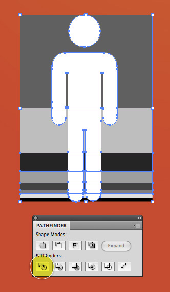 از شر شماره ها و خطوط خلاص شوید. از پانل Pathfinder مجددا استفاده کنید، بر روی Divide کلیک کنید. حالا هر بخش از انسان شما به یک مقطع مناسب تقسیم شده است. هم شکل ها را Ungroup کنید و از شر شکل های خاکستری دور لبه ها خلاص شوید.