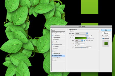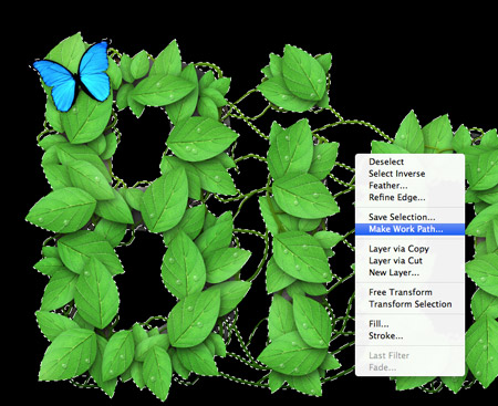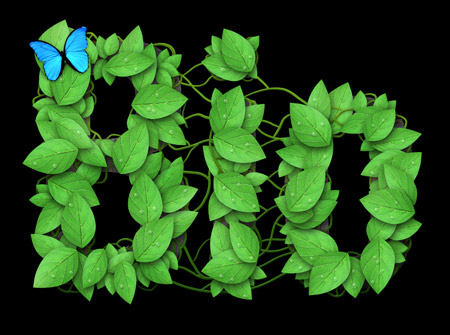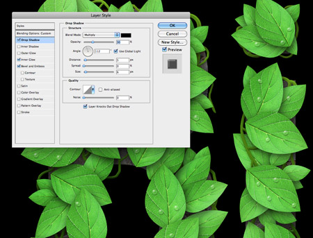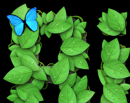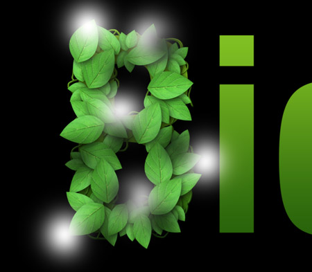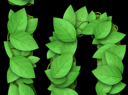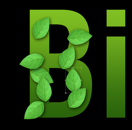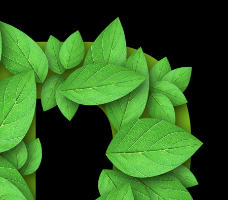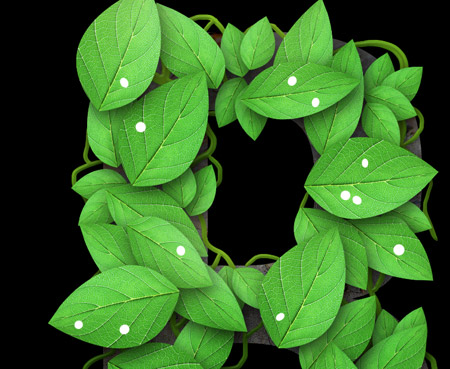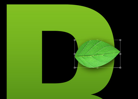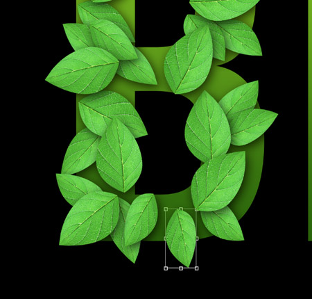 کپی هایی از برگ بعد از آن paste، rotate و با اندازه مناسب روی حرف اول قرار گرفته شدند. یک افکت Drop Shadow به اضافه کردن عمق به برگ ها کمک خواهد کرد.