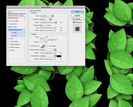 یک افکت Bevel و Emboss به تاک ها ظاهری سه بعدی با های لایت های سبز درخشنده و سایه های تاریک سبز می دهد.