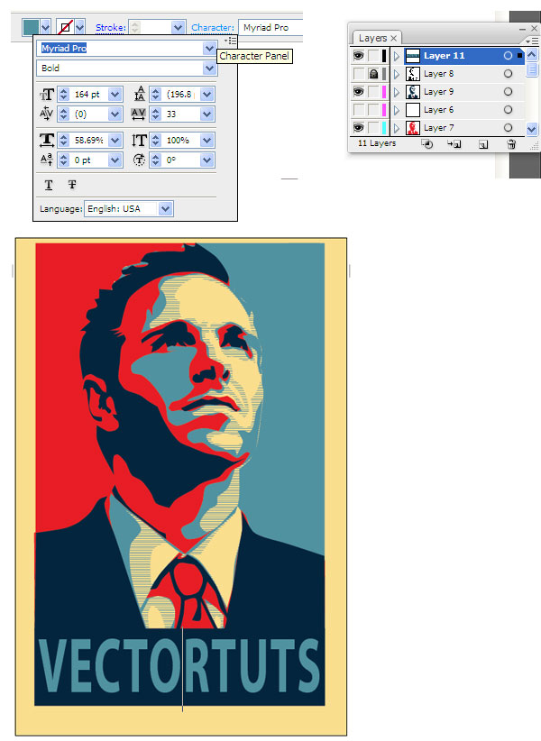 زمان اضافه کردن کلمات امیدبخش رسیده است. ما از آبی کم رنگ برای رنگ فونت استفاده می کنیم و می خواهیم تنظیمات متن را عوض کنیم تا کلمات بیشتر چهارگوش آبی تیره را پر کند. برای عوض کردن فضای بین حروف، از پنل Characterاستفاده کنید. این پنل زمانی که از ابزار متن Text Tool (T). استفاده می کنید در دسترس است. من از فونت Myriad Pro استفاده کردم.