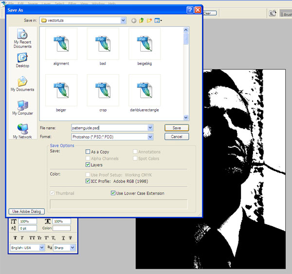 این لایه جدید ایجاد شده را به نام patternguide.psd ذخیره کنید. چرا که شما به آن در ایلستریتور نیاز پیدا خواهید کرد.