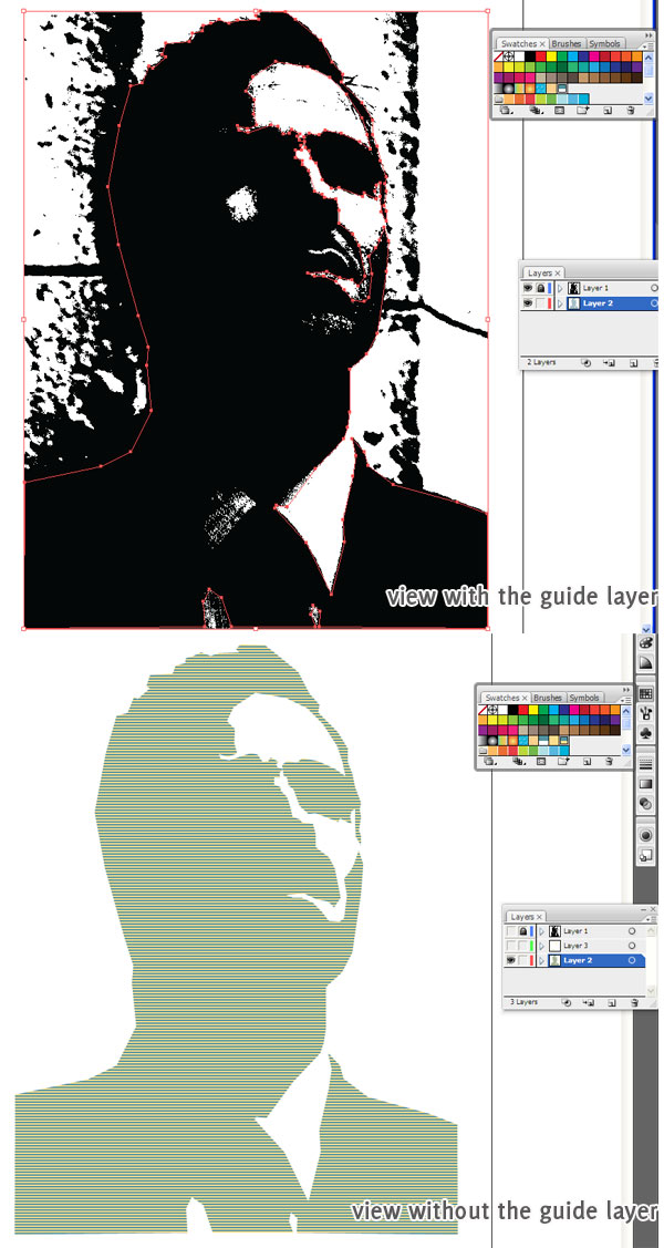 حالا ما می خواهیم لایه های راهنما را برای استفاده در ایلستریتور ایجاد کنیم. با دابل کردن لایه پوسترایز شده شروع کنید و نام این لایه ی جدید را Pattern Guide بگذارید. سپس مسیر Image > Adjustments > Thresholdرا دنبال کنید. با نشانه ی لغزنده مقداری بازی کنید تا به عکسی شبیه به عکس زیر برسید. ما می خواهیم عکس به صورت قابل توجهی تاریک شود اما هنوز مقداری از جزئیات معلوم باشد. همچنین زمانی که از Thresholdاستفاده می کنید بهترین کار این است که از Peaks که شما دیدید استفاده کنید.