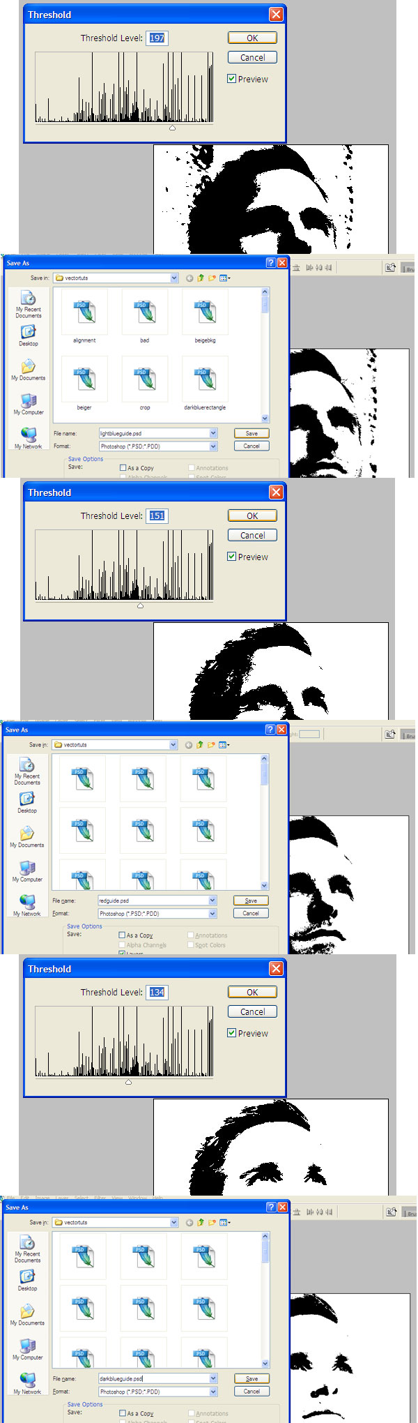ما نیاز داریم تا گام های 4 و 5 را برای 3 مرتبه تکرار کنیم. هربار threshold را مقداری کمتر اعمال کنید و هر لایه ی جدید را ذخیره نمایید. در زیر تنظیماتی که من استفاده کردم وجود دارد، بار دیگر به پیک ها توجه کنید.