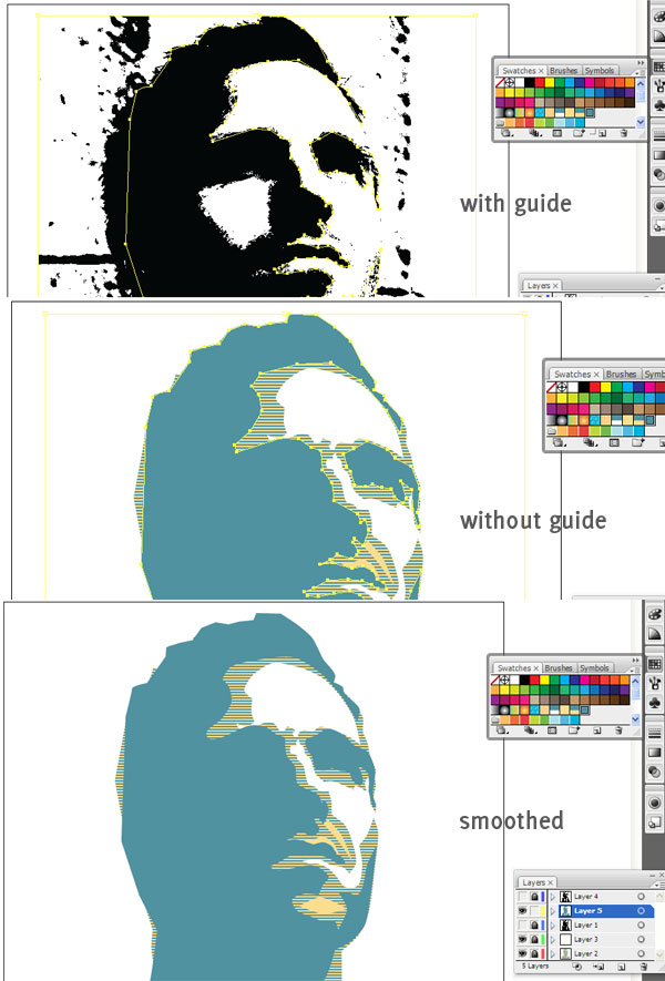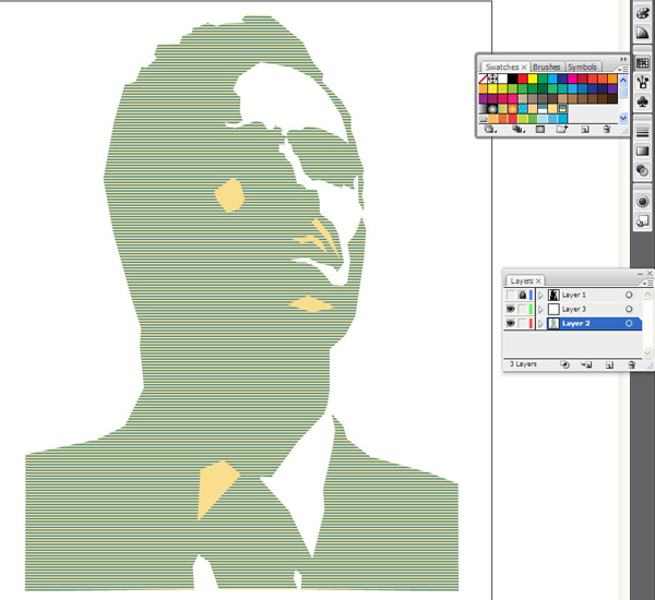 حالا ما ابزار قلم مان را انتخاب می کنیم، به آن یک حرکت تهی بدهید و الگوی مان را برای آن انتخاب کنید. سپس شروع به کشیدن همه نواحی مشکی با ابزار قلم کنید. کلید در متوسط آن است، بسیار دقیق لایه ی راهنما را دنبال نکنید فقط به صورت تقریبی طرح کلی را بکشید و نگران انحناها نباشید چرا که آن را بعد از ایجاد طرح کلی درست خواهیم کرد.