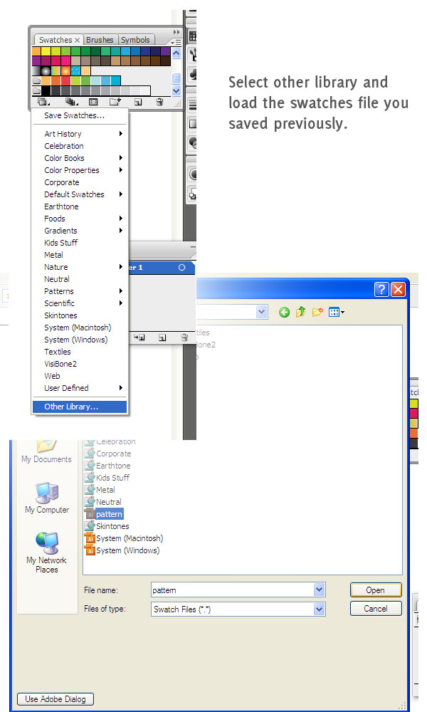 قبل از آنکه بتوانیم طرح کلی اولین لایه را بکشیم، ما باید الگوی مان را در Swatches Libraryبارگذاری کنیم. برای انجام این کار Other Library را از منوی Swatches Library در پنل Swatchesانتخاب کنید.