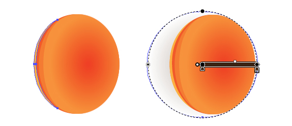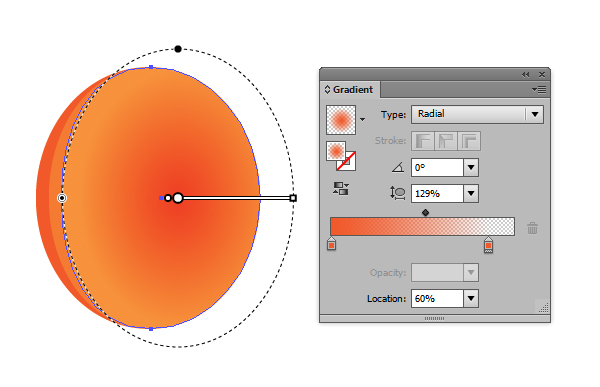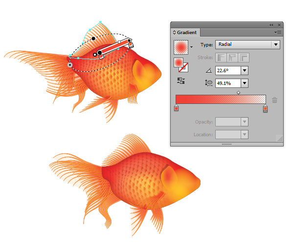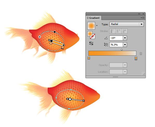 سپس در بالای فلس، من یک transparent radial gradient موجود در پانل Appearance را بکار بردم و منبع gradient را در سمت راست با استفاده از Gradient Tool قرار دادم.