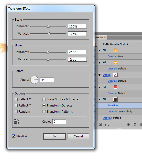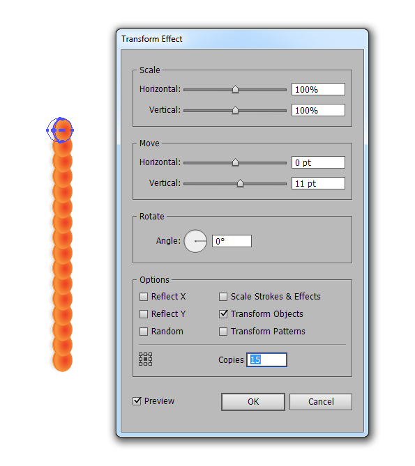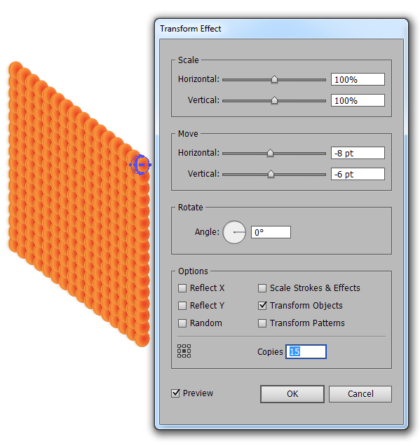 حالا تعداد زیادی از فلس ها برای پوشاندن بدن ماهی ها ایجاد کنید. خوشبختانه لازم نیست هر کدام را به تنهایی درست کنیم ما می توانیم از Effects > Distort & Transform > Transform effect استفاده کنیم. من شکل های فلس ها را Group می کنم Ctrl + Gو سپس Transform effect را با تنظیمات زیر به کار می برم.