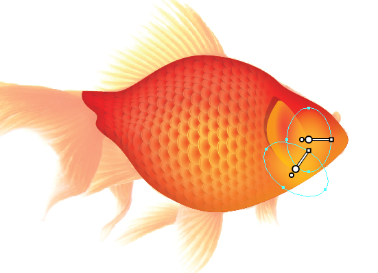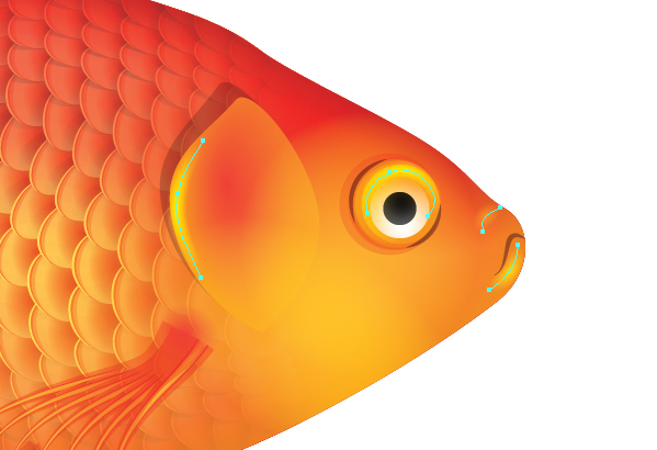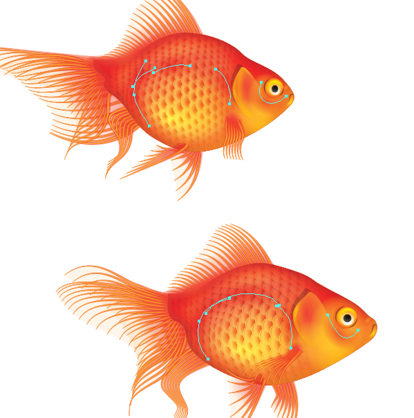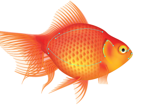 سپس با استفاده از Direct Selection من برای جابجایی دسته های تنظیم نقاط خاصی را روی بدن ماهی انتخاب کردم و آن ها را برای ایجاد یک برآمدگی به صورت منحنی در آوردم. من آن ها را برای ایجاد تراکم بیشتر فلس ها داخل آوردم و سپس آن ها را دور سر و آبشش ها ماهی که فلس وجود ندارد منحنی کردم.