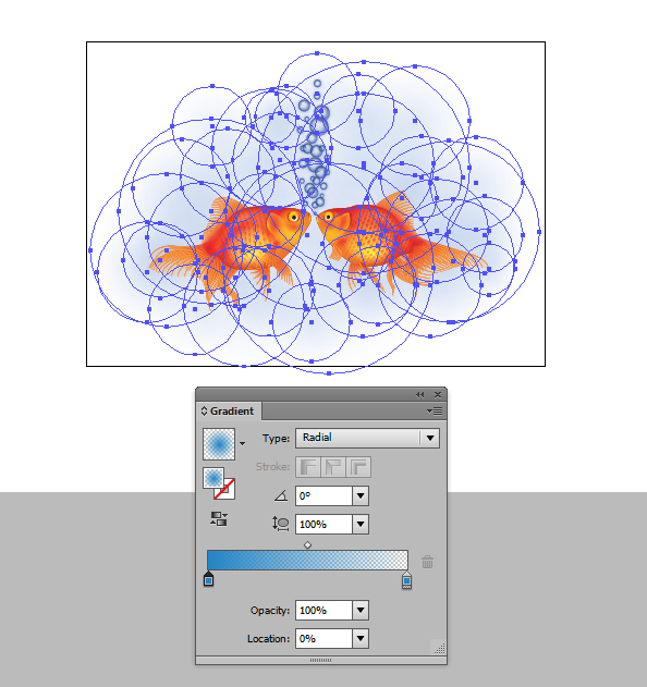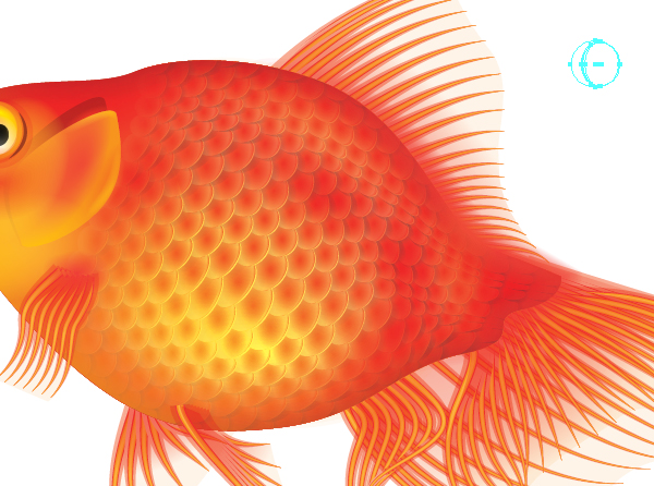 همین کار را در بالای blends تکرار کنید و یک transparent radial gradient در پایه شکل بکار ببرید که در نهایت آن به بدن ماهی متصل گردد. این شکل ها را در Blending Mode Color Burn, Opacity 80% تنظیم نمائید.