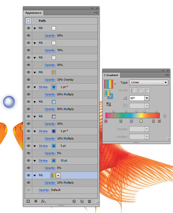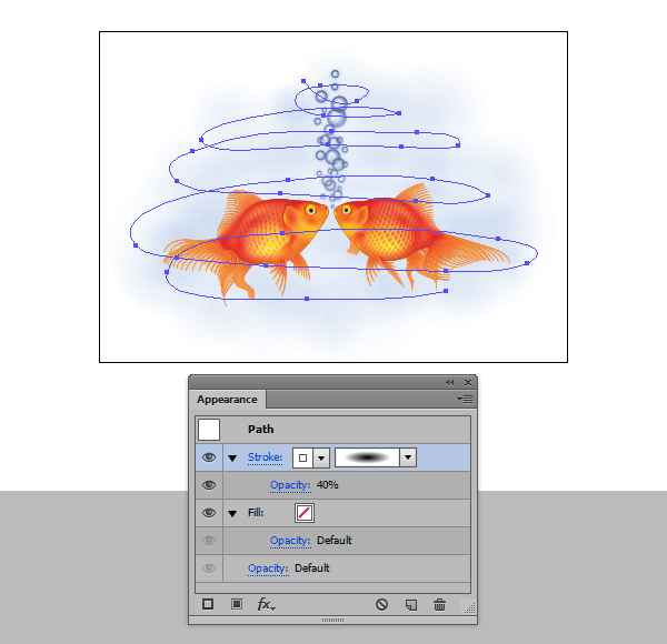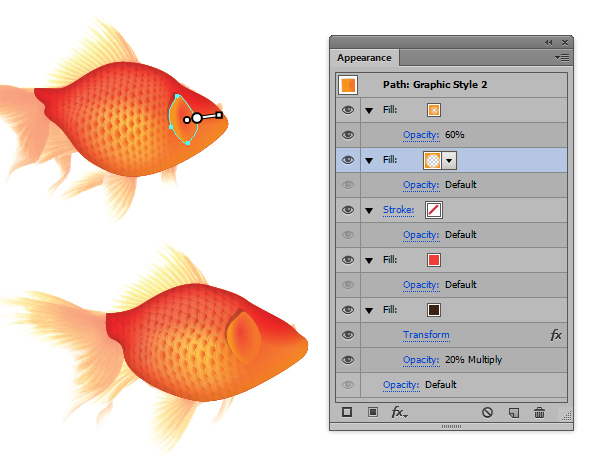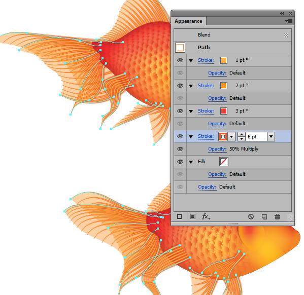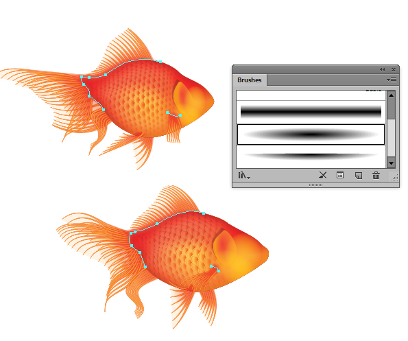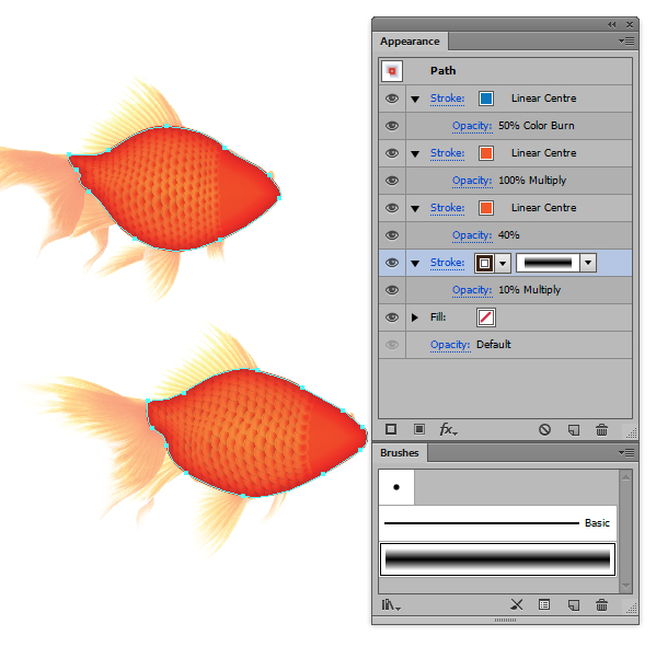 یکبار دیگر شکل کلی ماهی را تکرار کنید و تنظیمات زیر را در پانل Appearance بکار ببرید. برای brush من از آن چیزی که قبلا ایجاد کرده بودم "Blend Brush 1"/"Linear Centre" در لینک آموزش Jellyfish tutorial که در Stroke Weights 60pt, 14pt, 40pt و 6pt از بالا به پایین تنظیم شده است، استفاده کردم. این یک افکت inner glow که با 100% vector است ایجاد خواهد کرد! این شکل یکبار دیگر در Clipping Mask شما انجام داده شده است.