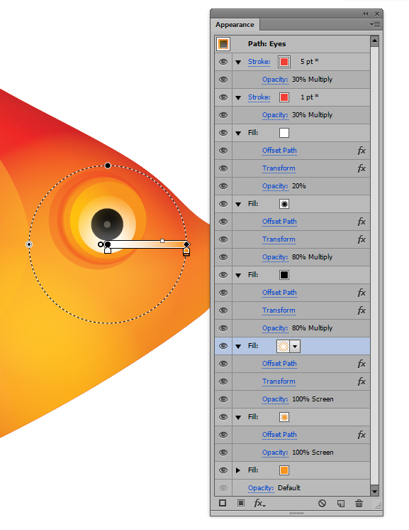برای ایجاد چشم ها، من یک دایره با استفاده از ابزار Ellipse ترسیم کردم و از تنظیمات زیر استفاده نموده ام. از بالا به پایین تنظیمات Offset Path و Transform effects همانند زیر است: