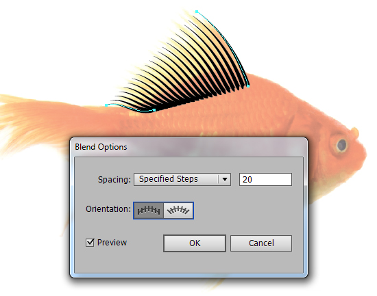 هر دو strokes را انتخاب کنید و سپس یک Blend ایجاد کنید (Ctrl + Alt + B). به Object > Blend > Blend Optionsبرای اصلاح Spacing به Specified Steps و شماره 20 بروید. گرچه این تنظیماتی بجا برای باله است اما از دیگران متمایز است پس آن را آنچنان که فکر می کنید درست است استفاده کنید.