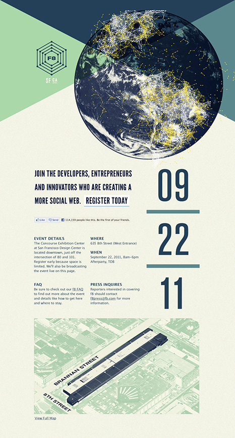 در 22 سپتامبر 2011 فیسبوک بزرگترین کنفرانس F8 خود را برگزار کرد. تیم طراحی موظف شد که بر اساس تجربیات گذشته هویتی برای این کنفرانس طراحی کند. این رویداد به منظور اطلاع رسانی به توسعه دهندگان وب برای نمایش امکانات فیسبوک در این زمینه برگزار شد.