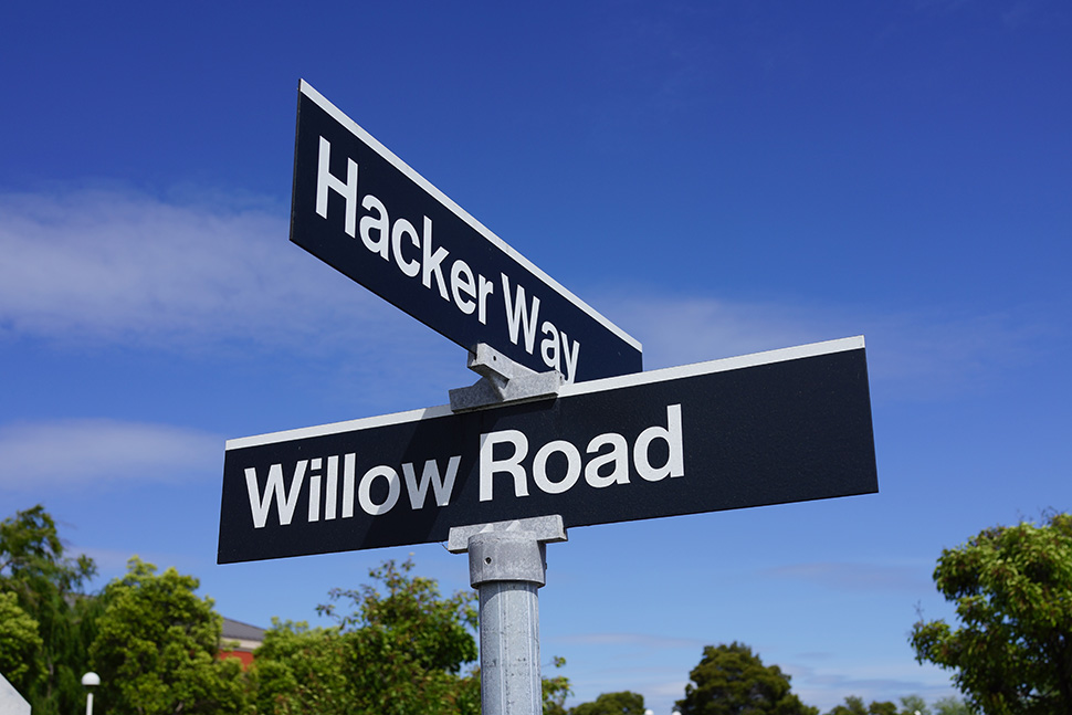 در سال 2012 فیسبوک به خانه جدیدش در منلو پارک کالیفرنیا نقل مکان کرد. آن ها در محوطه سابق دانشگاه مایکرو سیستمز (Sun microsystems) بودند. تیم طراحی فیس بوک در آن زمان تصمیم گرفتند به جای صرف هزینه های زیاد برای ساخت و نسب تابلوی جدید از تابلوی قدیمی مایکروسیستمز استفاده کنند و برای این کار از روش هکرها یعنی "تغییر هدف آنچه موجود است" بهره بردنند.