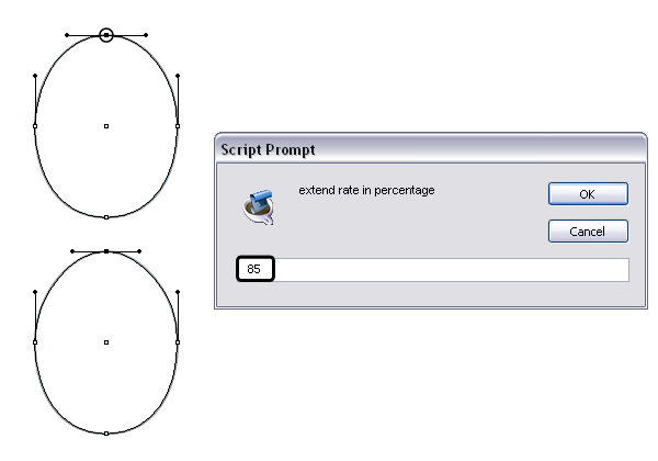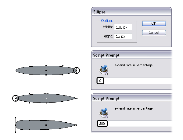 اول ابزار بیضی را بگیرید و یک بیضی با اندازه 100 x 15px بکشید. از ابزار Direct Selection Tool (A) برای انتخاب تنها نقطه راست استفاده کنید، سپس به مسیر File > Scripts > Extend Handles بروید و یک درصد صفر به آن اعمال نمایید. این کار باعث حذف شدن نقطه موجود خواهد شد. سپس نقطه چپ را انتخاب کنید، همان گزینه را انتخاب کنید و این بار یک درصد 280 قرار دهید. در نتیجه یک دسته ی بلندتر خواهید داشت.