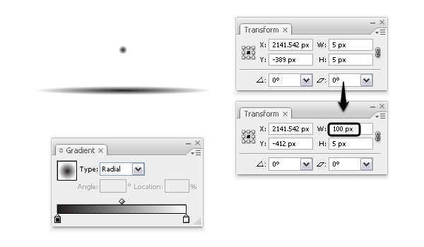 از ابزار بیضی Ellipse Tool (L) برای رسم یک دایره کوچک به اندازه 5 x 5pxاستفاده کنید و آن را با یک سایه ی شعاعی مشکی به سفید پر نمایید. با داشتن این دایره ی انتخاب شده به پنل Transformبروید و در قسمت Width مقدار 100pxرا به جای 5pxقرار دهید. با این کار یک بیضی مسطح خواهید داشت.