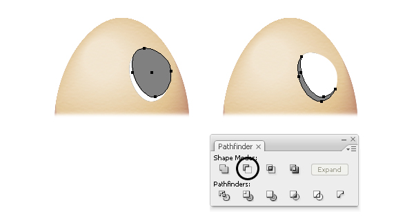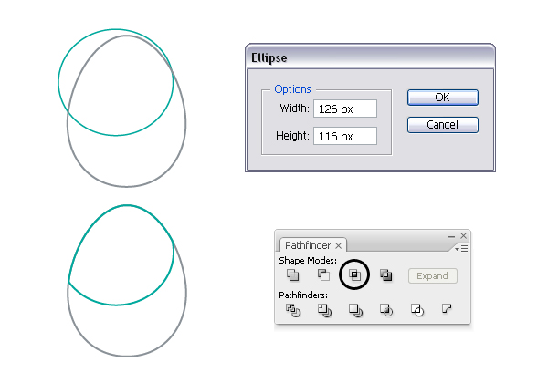 سپس ابزار بیضی را بگیرید و یک بیضی در جانب بالا و چپ شکل تخم مرغ بکشید. شکل تخم مرغ را کپی نمایید و Paste in Front )(Ctrl+F را انتخاب نمایید بعد از آن این کپی و بیضی را برگزینید و در پنل Pathfinder گزینه Intersectرا فشار دهید.