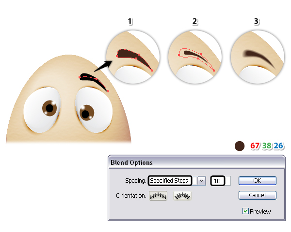 برای تغییر شکل دادن رنگ آمیزی در یک شکل، از منوی Objectگزینه Expand Appearance را انتخاب کنید سپس هر دو را Ungroup (Shift-Control-G) نمایید. شما به شکل ابرو خواهید رسید (1) یک کپی کوچک تر از این شکل بسازید و آن را در وسط قرار دهید. هر دو شکل را با قهوه ای تیره رنگ نمایید اما Opacity بزرگتر را صفر انتخاب نمایید. با داشتن هر دو شکل انتخاب شده، به مسیر Object > Blend > Blend Options بروید و 10 Specified Steps. را انتخاب کنید. به مسیر Object > Blend > Make (Alt-Control-B) بازگردید و شما به ابروی راست خواهید رسید.