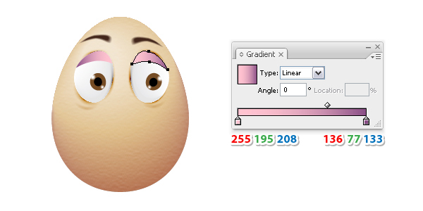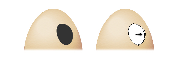 شکلی را که در گام پیشین ساختید حرکت دهید و آن را در بالای تخم مرغ قرار دهید و یک رنگ مشکی برای آن انتخاب نمایید. این شکل را کپی نمایید و Paste in Front (Ctrl+F) را انتخاب کنید و رنگ سفید را برای آن جایگزین نمایید سپس از ابزار Direct Selection Tool (A) برای انتخاب تنها نقطه سمت راست استفاده کنید و آن را مقداری به سمت راست حرکت دهید.
