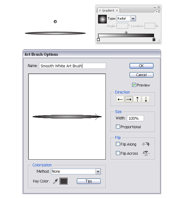 به یاد دارید که پیش تر قلموی Smooth Black Art Brushرا ساختید؟ درست است، حالا شما به ورژن سفید آن نیاز دارید. با یک دایره به اندازه 5 x 5px شروع کنید که یک سایه شعاعی از سفید به مشکی در آن وجود دارد سپس مقدار عرض را از 5 به 100 تغییر دهید. Expand را انتخاب کنید و تمام توضیحات در قسمت 5 را به منظور ذخیره کردن قلمو دنبال کنید. این قلمو را Smooth White Art Brush. بنامید.