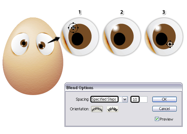 بر روی چشم راست زوم نمایید و یک دایره در قسمت بالا و چپ تخم چشم بکشید، سپس یک دایره کوچکتر در مرکز قرار دهید (1) هر دو دایره را با سفید پر نمایید منتها Opacity دایره بزرگتر را صفر درصد قرار دهید. با داشتن هر دو دایره انتخاب شده به مسیر Object > Blend > Blend Optionsبروید و 10 Specified Steps را انتخاب کنید و تایید نمایید.