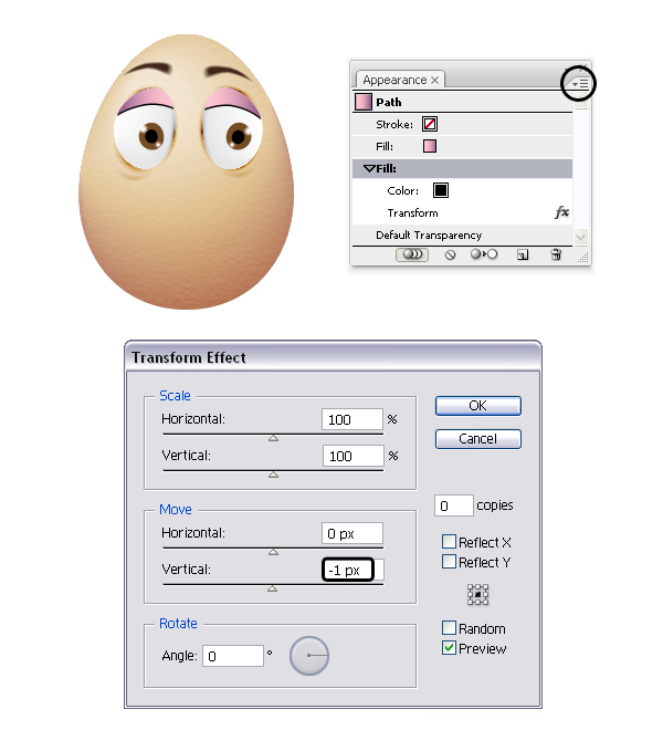 با داشتن پلک راست انتخاب شده، از پنل Appearance و منوی fly-out یک پرکردن جدید زیر اولین اضافه نمایید. به عنوان رنگ ، مشکی را برگزینید سپس به مسیر Effect > Distort & Transform > Transform, بروید و در فیلد Move Vertical مقدار 1- را تایپ کنید و اوکی نمایید. در نتیجه به یک خط چشم مشکی خواهید رسید. چیزهای مشابه را برای پلک چپ تکرار کنید.