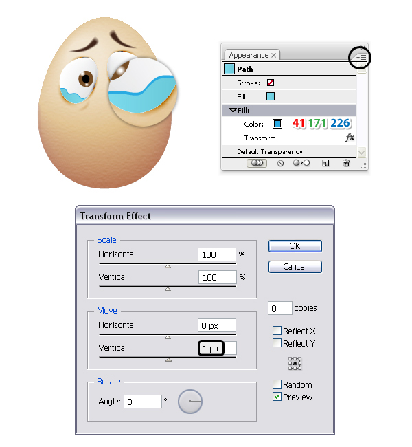 شکل آب از چشم راست را انتخاب کنید و یک قسمت جدید زیر اولین منوی fly-out از پنل Appearance اضافه نمایید. از سایه ی آبی مشخص شده به عنوان رنگ استفاده کنید سپس به مسیر Effect > Distort & Transform > Transform, بروید و در فیلد Move Vertical مقدار 1 را تایپ نمایید و اوکی کنید. چیزهای مشابه را برای شکل آب چشم چپ انجام دهید.