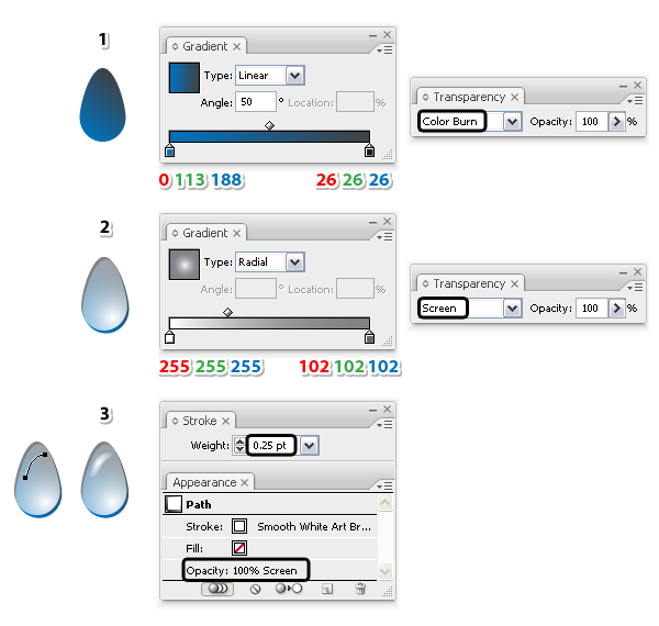 بیایید با قطره های اشک ادامه دهیم. ابتدا یک شکل شبیه به قطره بکشید و آن را با سایه ی خطی نشان داده شده پر نمایید که زاویه ای برابر با 50 درجه داشته باشد. Blending Mode راColor Burn قرار دهید (1) شکل قطره را کپی و Paste in Front نمایید سپس آن را مقداری به سمت بالا و چپ حرکت دهید. سایه موجود را با یک سایه ی شعاعی سفید به خاکستری جایگزین نمایید سپس آن را Blending Mode Screen قرار دهید. (2) سپس یک مسیر کوچک در قسمت بالا و چپ قطره بکشید و آن را با قلموی Smooth White Art Brush. رنگ آمیزی نمایید. مقدار Stroke Weight را 0.25 قرار دهید و Blending Mode را Screen کنید (3)