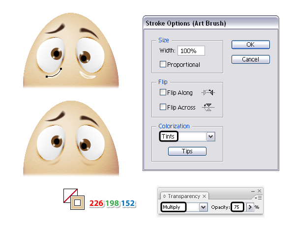همان طور که هر دو مسیر را انتخاب شده دارید، به پنل Appearance بروید و بر روی قلموی رنگ آمیزی اعمال شده دابل کلیک نمایید تا پنجره Stroke Options باز شود. به عنوان Colorization گزینه Tints را انتخاب کنید و اوکی بنمایید. حالا قهوه ای روشن را به عنوان رنگ انتخاب کنید و قلمو رنگ را به خود خواهد گرفت. هر دوی آنها را Blending Mode Multiply قرار دهید (سفید شفاف می شود) و مقدار Opacityرا 75 درصد قرار دهید.