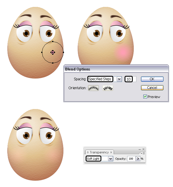 با داشتن هر دو دایره انتخاب شده به مسیر Object > Blend > Blend Options بروید و 10 Specified Steps را انتخاب کنید سپس به مسیر Object > Blend > Make (Alt-Control-B). بازگردید. Blending Mode راSoft Light برای گروه مخلوط نتیجه قرار دهید سپس یک کپی از این گروه برای گونه ی چپ بگیرید.