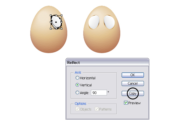 همه شکل هایی که با آن چشم راست را ایجاد کردید را انتخاب کنید و آنها را گروه بندی نمایید. Group (Control-G) با داشتن این گروه انتخاب شده به مسیر Object > Transform > Reflect, بروید، Vertical را چک کنید و Copyرا بزنید. با این کار شما به چشم چپ و هر آنچه برای قسمت راست انجام دادید، خواهید رسید.