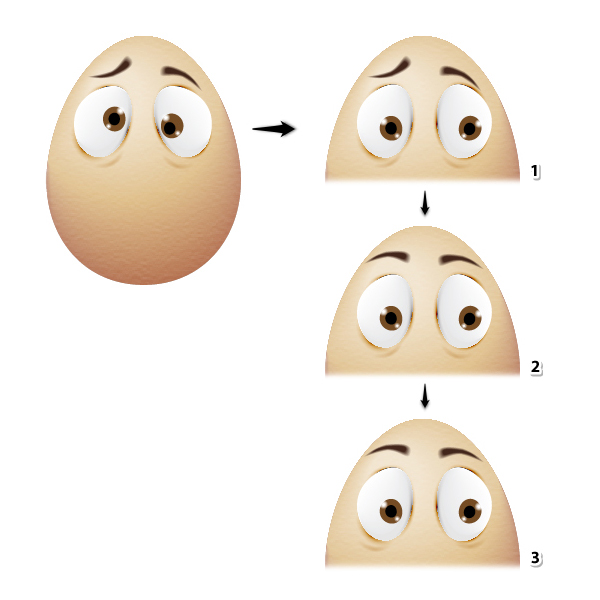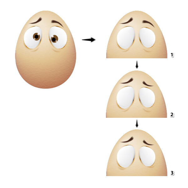 در این نقطه اولین کاراکتر تخم مرغ آماده است و شما می توانید از آن برای ساختن انواع دیگر کاراکترها استفاده کنید. با کپی کردن از اولین تخم مرغ شروع کنید و بر روی چشم ها تمرکز نمایید و موقعیت مردمک ها، تخم چشم ها و برق چشم ها را همانطور که در شکل نشان داده شده است حرکت دهید (1) سپس محل قرارگیری ابروها را تغییر دهید (2) و در نهایت، موقعیت چین و چروک های زیر چشم ها را با حرکت دادن آنها به سمت بیرون و مقداری چرخاندن آنها تغییر دهید.