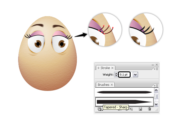 بر روی پلک راست زوم نمایید و از ابزار قلم برای کشیدن سه مسیر به سمت بیرون استفاده کنید. این مسیرها را با Tapered-Sharp Art Brush که شما می توانید در Brush Libraries Menu > Artistic >Artistic_Ink پیدا کنید رنگ آمیزی نمایید، سپس مقدار Stroke Weight را 0.1 قرار دهید. چیزهای مشابه را برای ساخت مژه های چپ تکرار کنید.