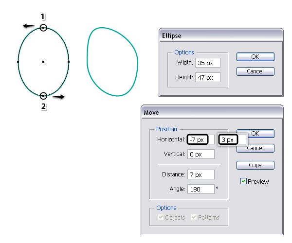 از ابزار بیضی برای کشیدن یک بیضی جدید با ابعاد نشان داده شده استفاده کنید. ابزار Direct Selection Tool (A) را انتخاب کنید و تنها نقطه بالایی (1) را برگزینید سپس به مسیر Object > Transform > Moveبروید و در فیلد Horizontal مقدار -7px را بگذارید و اوکی نمایید. سپس نقطه پایینی را انتخاب کنید (2) و به مسیر Object > Transform > Moveبروید و در فیلد Horizontal مقدار 3px را بگذارید و اوکی نمایید.