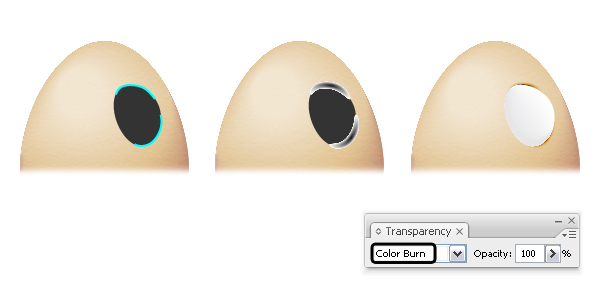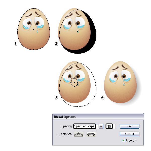 سپس یک کپی کوچک تر از این شکل در مرکز بگیرید. هر دو شکل را با مشکی پر کنید اما مقدار Opacity برای شکل بزرگتر را صفر درصد قرار دهید (3) با داشتن هر دو شکل انتخاب شده به مسیر Object > Blend > Blend Options بروید و 30 Specified Steps را انتخاب کنید و تایید نمایید. به مسیر Object > Blend > Make (Alt-Control-B) بازگردید و سایه آماده است (4). به دلیل آنکه نور از جایی بالا و سمت چپ بر روی تخم مرغ می افتد سایه می بایست در قسمت پایین و راست باشد.