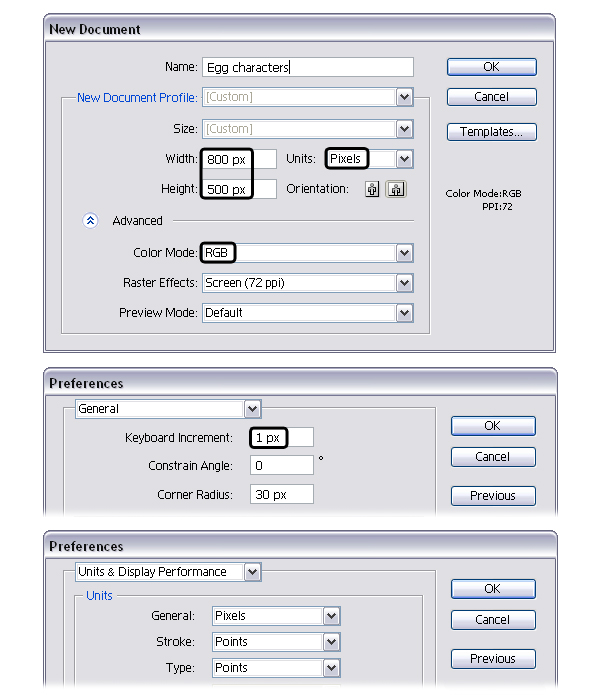 نرم افزار ایلستریتور را باز کنید و به مسیر File > New بروید تا یک صفحه سفید باز کنید. یک نام برگزینید و ابعاد را تنظیم نمایید به عنوان Unit گزینه Pixels را انتخاب کنید و برای Color mode گزینه RGB را برگزینید.